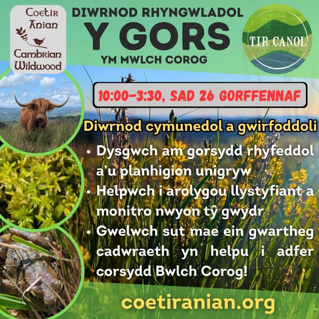 Join Coetir Anian and Tir Canol at Bwlch Corog near Machynlleth to celebrate the brilliance of Bogs! Come and see the upland bog we’re restoring, and learn what makes bogs so special and why bogs and other peatlands are so important.